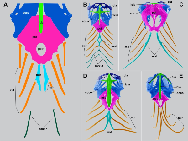 图3 有鳞类胸骨结构的多样性:A. 胸骨结构示意图;B. 板蜥科;C. 美洲鬣蜥类;D. 臼齿蜥科;E. 巨蜥科。