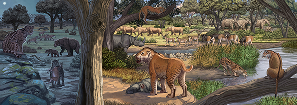 8.恐近剑齿虎和后裂爪蹄兔,9.祖鹿,10.三趾马,11.剑齿象,12.英良副剑齿虎,13.永登吉猫