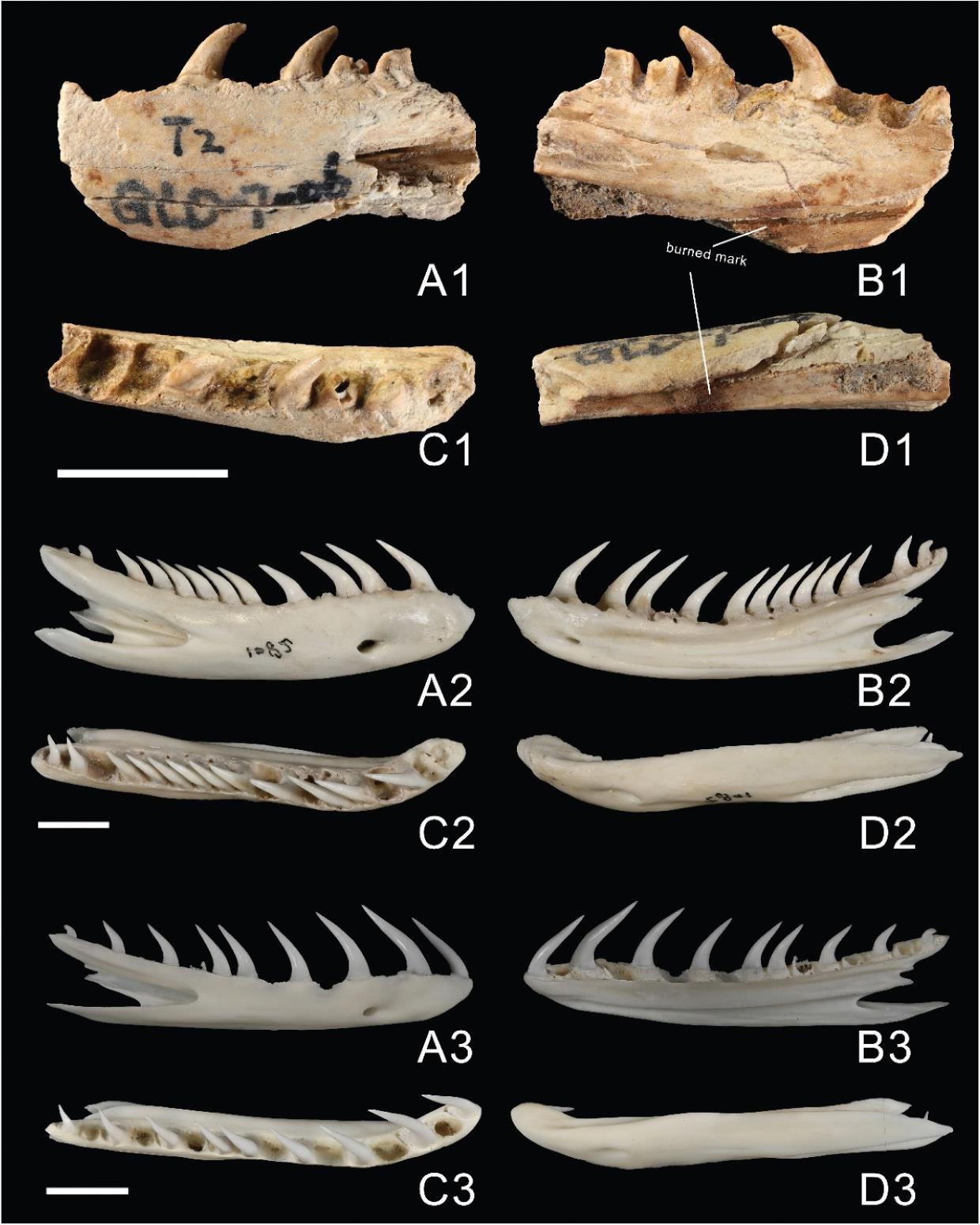 左江流域贝丘遗址的缅甸蟒齿骨材料,以及与现生缅甸蟒和网纹蟒对比