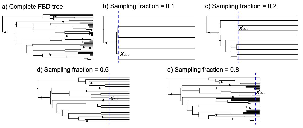针对该问题,中国科学院古脊椎动物与古人类研究所张驰研究员联合中科院动物研究所罗阿蓉副研究员、朱朝东研究员、周青松博士和悉尼大学Simon Ho教授开展合作研究。该研究采用计算机模拟,在化石生灭过程和多样化取样策略下(Zhang et al. 2016),以不同的比例取样现生物种(图1),并模拟化石的形态数据以及现生物种的形态和分子数据。然后使用贝叶斯支端定年法和BEAST2软件进行分析。研究还分析了一组胎盘哺乳动物的真实数据和模拟的结果进行对比。