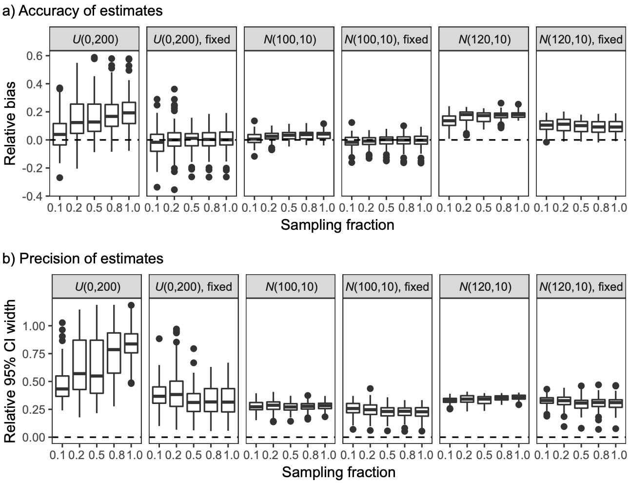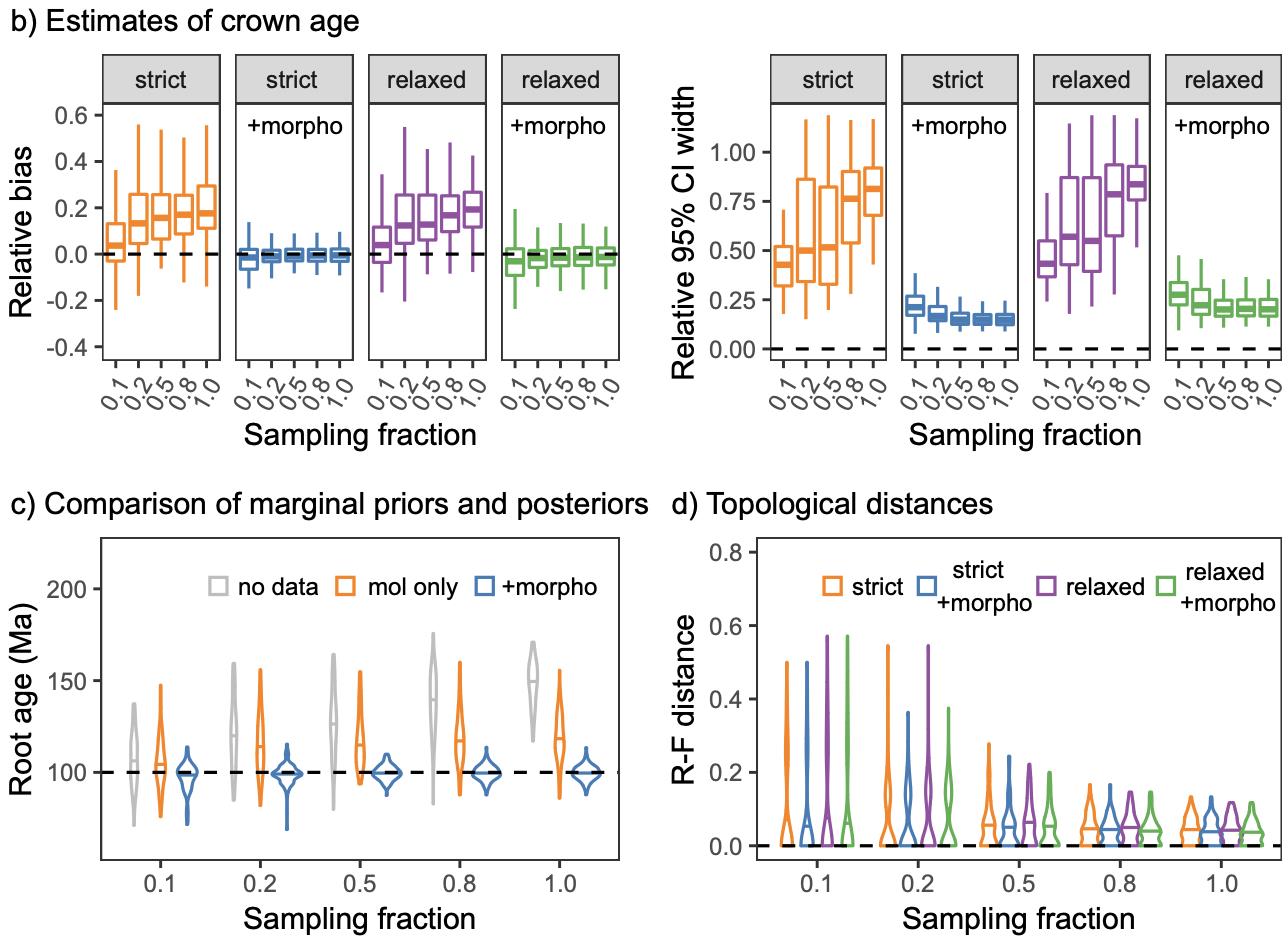 图2:不同取样密度下参数估计的准度和精度。考察了严格和宽松分子钟以及是否使用形态特征等情况。