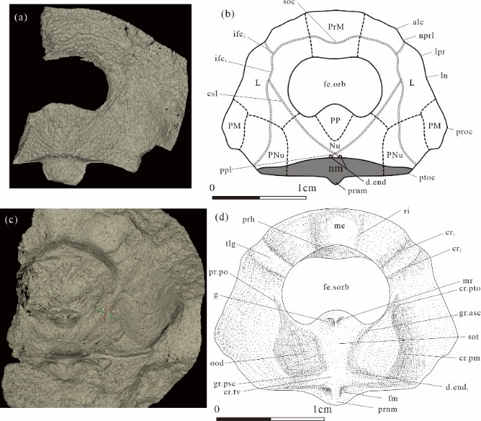 华南沟鳞鱼类的发现与研究始于1940年计荣森先生对采自湖南长沙跳马涧地区中华沟鳞鱼的研究,中华沟鳞鱼(B. sinensis)也因此成为第一种由中国人正式记述的古生代鱼类化石,标志着中国古生代鱼类研究的正式开启,树立起我国古鱼类研究中一个极为重要的里程碑。其后在云南昆明、武定、曲靖,广东韶关、乐昌等地区先后发现并报道了沟鳞鱼类的新材料,极大地丰富了我国沟鳞鱼类的时空分布及多样性。然而沟鳞鱼类的早期类型迄今所知仍非常有限,头甲保存完整的化石材料也非常稀少,致使对其头甲三维结构的认知及对该类群的早期演化、生物古地理与生物地层学意义的认识并不清晰、全面,亟需化石材料的新发现予以澄清。