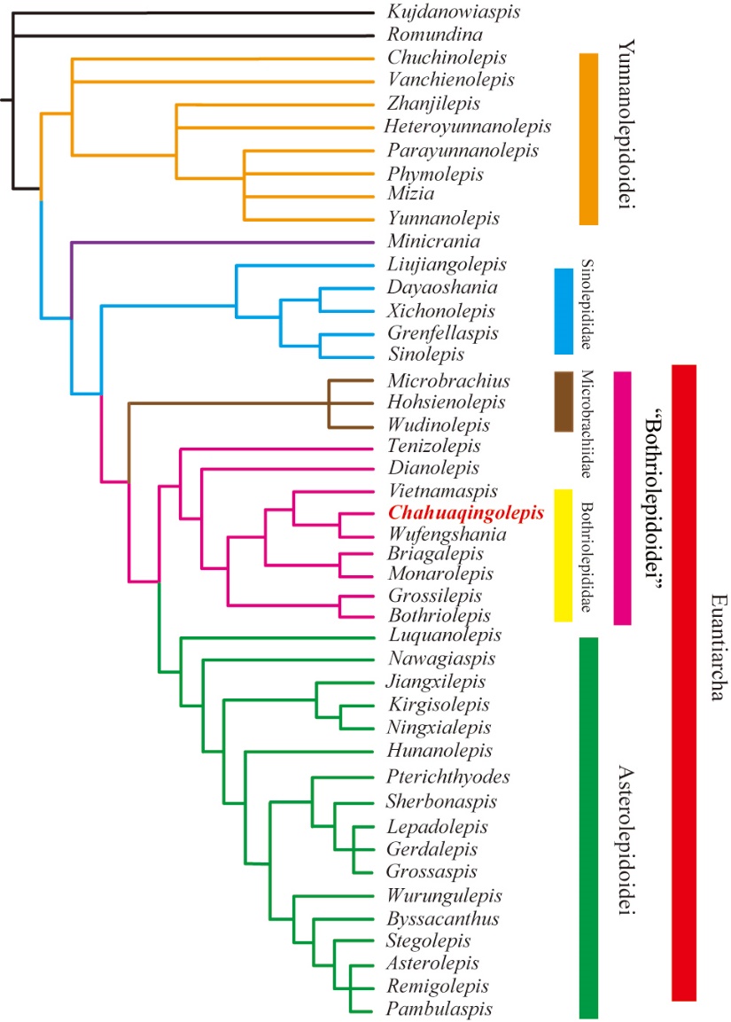 课题组通过应用Micro-CT扫描、三维复原等技术手段,对沟鳞鱼类新物种的两件头甲开展了详细的形态学、比较解剖学的研究及系统发育分析,建立了沟鳞鱼类一新属、新种——大孔茶花箐鱼(Chahuaqingolepis magniporus)(图1),其头甲形状近似六边形、头甲后缘前部具后侧角、眶孔大、眶前凹发育、横颈脊发育、中颈片完全包裹后松果片、感觉管系统均为典型的“沟鳞鱼型”等特征均表明其应归属于沟鳞鱼科(图2),系统发育分析结果支持了这一观点,并表明在禄劝地区发现的新属茶花箐鱼(Chahuaqingolepis)与在武定地区发现的五凤山鱼(Wufengshania)互为姐妹群,其系统发育位置位于沟鳞鱼类基干类群与较进步的沟鳞鱼类类群之间(图3)。茶花箐鱼代表了在云南禄劝地区中泥盆统中首次发现的沟鳞鱼类,其发现不仅丰富了沟鳞鱼类在泥盆纪期间的多样性、加深了对沟鳞鱼类头甲特征的鉴别与认识,而且填补了沟鳞鱼科支系早期类型的“缺环”、帮助深入理解并阐明了沟鳞鱼类的早期演化过程。