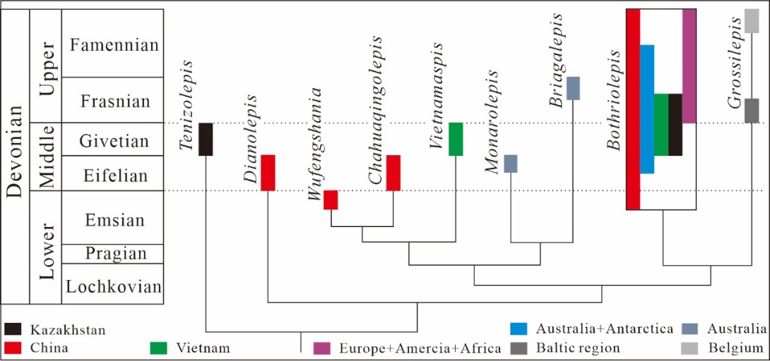 沟鳞鱼科是在泥盆纪末期就已绝灭的盾皮鱼纲胴甲鱼目中的一个单系类群,其模式属沟鳞鱼属(Bothriolepis Eichwald,1840)的研究历史悠久,是胴甲鱼类中分布最广泛、多样性最高的一个属,全球发现的该属中种的数量迄今已超过60个。除模式属以外,以往得到学界认可的、归入沟鳞鱼科的属仅包括5个——发现于中国云南武定的Wufengshania、越南北部的Vietnamaspis、澳大利亚东南部的Monarolepis与Briagalepis,以及产于欧洲波罗的海与比利时的Grossilepis,而在哈萨克斯坦及中国云南武定地区分别发现的Tenizolepis与Dianolepis则被看作沟鳞鱼类中的基干类群。在中国云南武定及曲靖地区距今约4亿年前的下泥盆统中发现的沟鳞鱼未定种(Bothriolepis sp.)及五凤山鱼(Wufengshania)代表了沟鳞鱼类最早的化石记录,指示华南是沟鳞鱼类的起源和演化中心。华南是全球深入开展沟鳞鱼类研究最重要的地区。