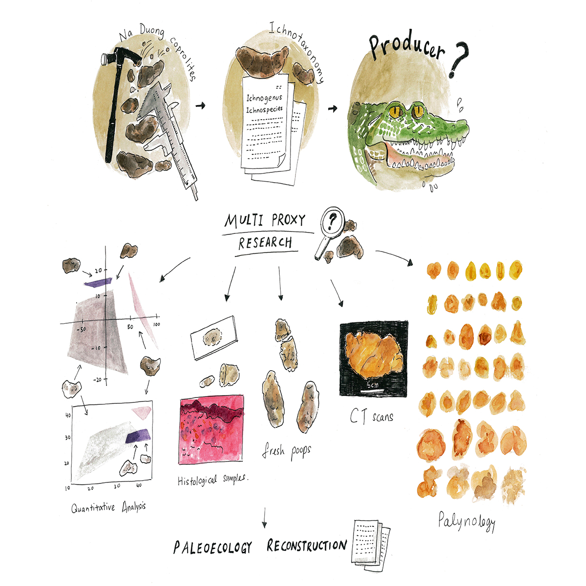 近年来,粪化石研究在多个领域备受关注。粪化石,是一种遗迹化石,是获取生物食性、运动、消化道结构、营养关系等信息的重要证据。该团队对越南北部始新世晚期的大量鳄类粪化石进行了系统研究,包括形态学、埋藏学、古生态学、孢粉学、生物地球化学及系统分类等,揭示了那阳鳄类化石与现生鳄类的解剖学联系。他们还通过粪化石相关的生态学研究对那阳盆地的古环境面貌进行了重建,并深入了解捕猎关系。那阳盆地在地质时期中可能存在着河流或湖泊,食物资源充足,有利于生物生存,鳄形类动物群在这里繁盛发展。