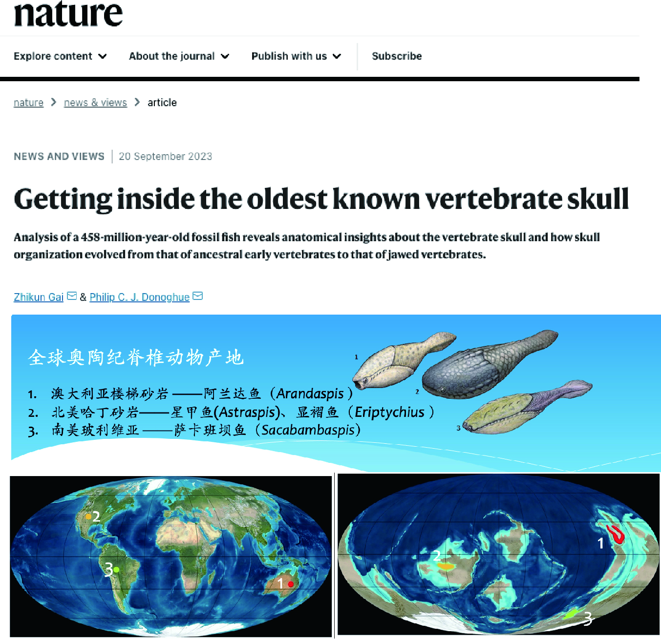 9月20日,英国《自然》(Nature)杂志在线发表了古脊椎所盖志琨研究员题为“最古老脊椎动物脑颅内部解剖” 的新闻评述文章,对同期英国伯明翰大学等的4.58亿年前奥陶纪显褶鱼(Eriptychius)三维脑颅研究成果进行了亮点评述,并从演化-发育生物学的角度讨论了脊椎动物头骨早期发育和演化的几个关键的阶段。显褶鱼是目前世界上仅有的几个奥陶纪脊椎动物化石,其中一块标本更是在博物馆的抽屉沉睡了半个多世纪。研究人员通过X射线断层扫描意外发现了深埋在岩石里面的最古老的三维保存的脊椎动物脑颅,并揭示了其内部解剖学特征,为脊椎动物头骨的早期演化提供了新的化石证据。