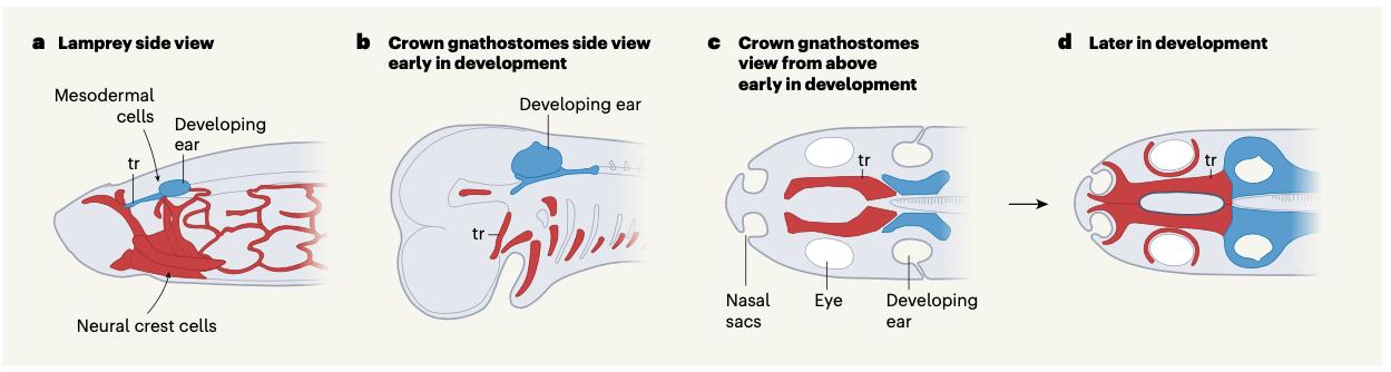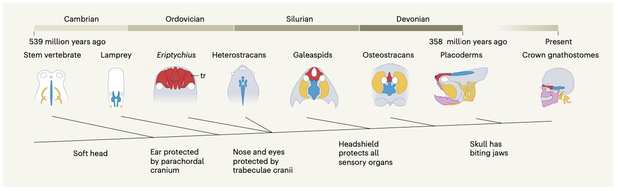 头骨是脊椎动物骨骼中最复杂的结构之一,在形态和解剖学上展示出了令人难以置信的多样性,而且令人惊讶的是,我们的头骨是由许多不同胚胎和演化起源的组件结合而成,这包括构成我们人脸大部分的外骨骼、包围和保护我们大脑和感觉器官的脑颅、以及包括鳃弓、颌和中耳听小骨的咽颅。虽然我们头骨的主要组成部分,在有颌类演化之初就已经形成,并广泛存在于现生有颌类的鲨鱼和硬骨鱼中。但是,追溯它们的演化起源却是一件困难的事情,因为现生的有颌类和圆口类(无颌类)展示出不同的头骨结构。