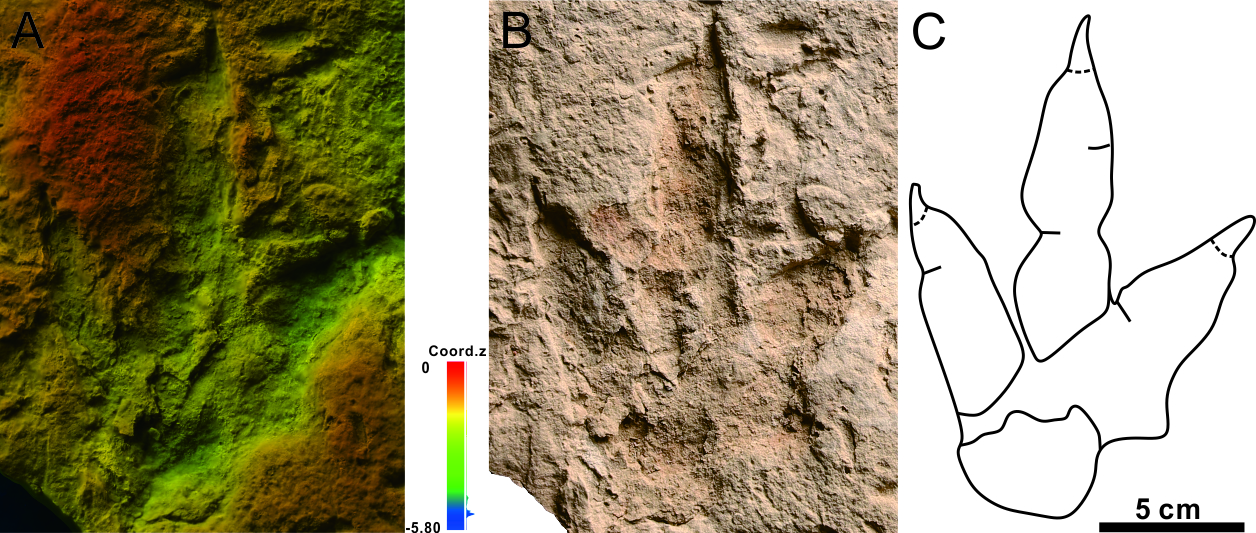近日,中国科学院古脊椎动物与古人类研究所汪筱林研究团队与沈阳师范大学和哈密博物馆合作,在国际学术期刊《历史生物学》(Historical Biology)在线发表了关于哈密翼龙动物群兽脚类足迹化石的研究成果。依据兽脚类足迹的大小,推断造迹恐龙的臀高约65 cm,体长约171 cm,体重约30 kg,为小型兽脚类恐龙。这是哈密及吐哈盆地白垩纪恐龙足迹的首次发现,增加了哈密翼龙动物群的多样性。