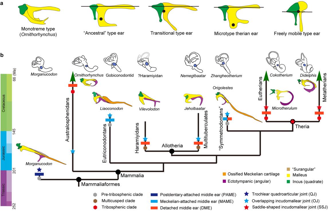 哺乳动物中耳是渐进演化的经典案例。现生哺乳动物的中耳具有三块听小骨(锤骨、砧骨、镫骨),而爬行动物中仅有一块耳柱骨。十九世纪欧洲生物学家已经观察到了现生哺乳动物中耳听小骨的多样性(图1)。同时,胚胎生物学家通过追索哺乳动物的胚胎发育过程,发现了听小骨源于形成第一鳃弓的胚胎组织,并通过系统比较四足动物头骨发育的差别,构建了有关哺乳动物中耳听小骨同源性假说的基本框架:锤骨与爬行类的关节骨和前关节骨同源,砧骨与爬行类头骨上的方骨同源,镫骨与耳柱骨同源。二十世纪初,一系列保存完好的下孔类化石的发现进一步支持了这一假说。在过去很长时间里,由于化石保存问题,哺乳动物中耳早期演化的讨论一直缺乏直接的化石证据。研究表明哺乳动物中耳听小骨经历了下颌中耳和过渡型中耳两个演化阶段,最终完全脱离下颌进入中耳腔。这一演化事件在中生代哺乳动物不同支系中多次发生。最有代表性的是二十世纪70年代对摩根齿兽头骨的系统研究,明确了下颌中耳这一演化阶段,以及过去二十多年,以燕辽、热河生物群化石为代表的中生代原始类群中所保存的过渡型中耳。然而,这些发现集中于基干类群,主要包括柱齿兽类、异兽类、真三尖齿兽类和对齿兽类,而在与我们人类演化密切相关的兽类(包括真兽类和后兽类)祖先中,中耳演化的直接证据十分有限。