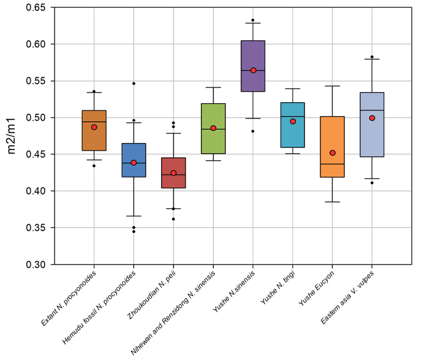 图4 不同貉(Nyctereutes)以及相关物种的臼齿比 m2/m1 框图