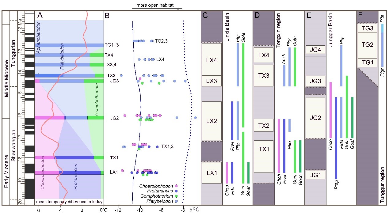 图2. 中国北方早–中中新世三类长颌象的相对丰度、牙釉质 13C同位素值以及不同地点象类化石组合和相应的生物年代(李春晓 供图)