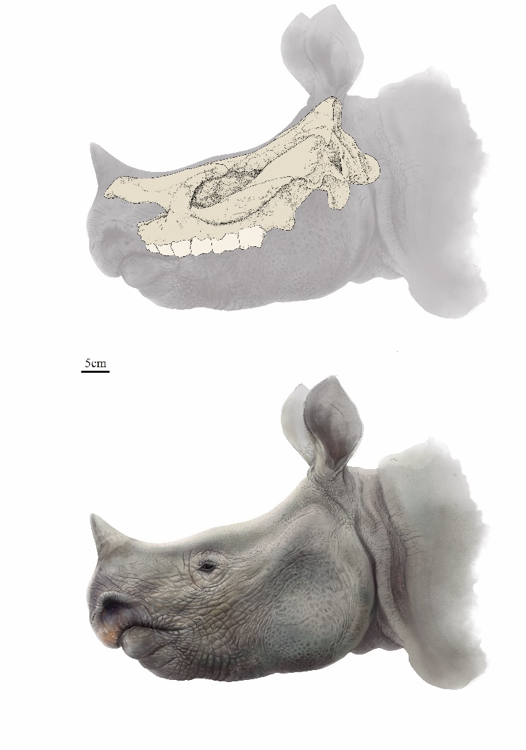 图2 翘鼻角犀头部复原图(郭肖聪 绘制)