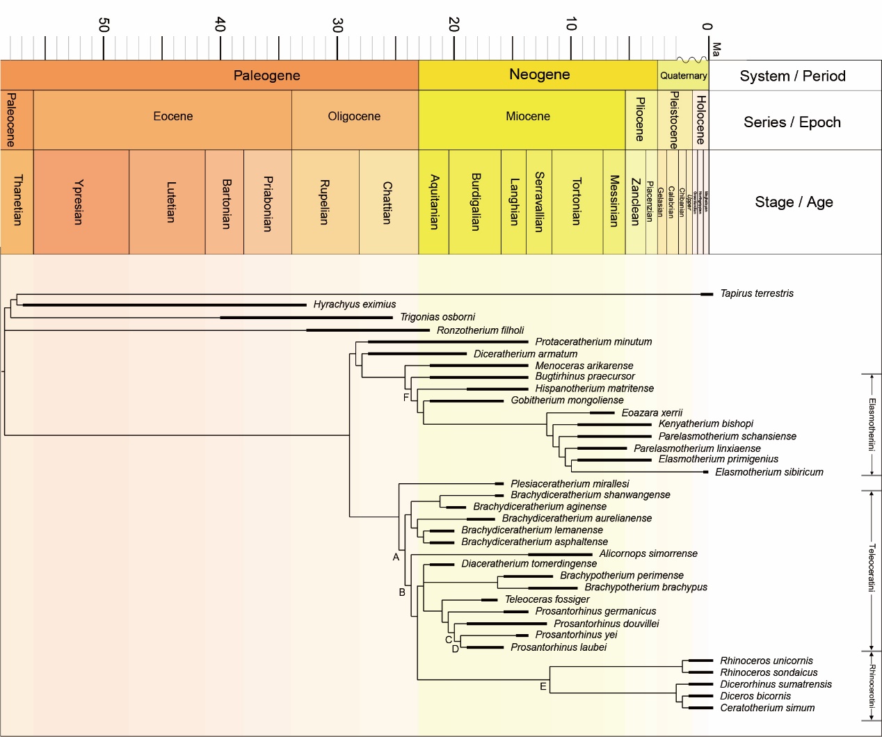 翘鼻角犀生存于中新世早期到中期,过去只在西欧与南亚地区发现过。目前已知最早的翘鼻角犀出现于南亚地区的巴基斯坦,时代为中新世早期距今2150~2000万年之间,而欧洲地区到距今2000万年之后才开始出现小型的远角犀类,是与安琪马同时迁徙到欧洲的翘鼻角犀属内成员。其中,劳氏翘鼻角犀(Prosantorhinus laubei)体型中等且纤细,生存于距今2000~1800万年之间,分布于德国和捷克地区;杜氏翘鼻角犀(Prosantorhinus douvillei)体型较小,是生存时限相对较长的物种,从距今2000万年前一直延续到1200万年前,分布于法国、西班牙和葡萄牙地区;德国翘鼻角犀(Prosantorhinus germanicus)生存于距今1700~1300万年之间,分布于德国和法国地区。然而,由于化石记录的稀缺性,翘鼻角犀属在亚洲的演化与迁徙情况此前并不清楚。