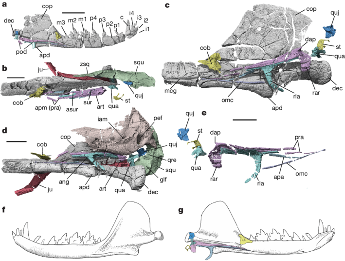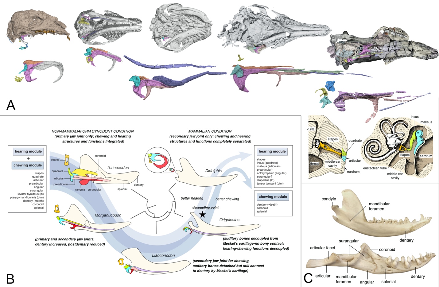 哺乳动物颌关节和中耳演化过程,是脊椎动物渐进演化最为经典,也是研究最为深入的例子。在爬行动物中,下颌和头骨的关节,是通过下颌的关节骨和头骨的方骨来实现的。在哺乳动物中,这个关节演变为中耳听小骨砧骨-锤骨之间声音震动传导的关节,而下颌和头骨的关节则由下颌齿骨和头骨鳞骨构成。从爬行动物的方骨-关节骨的颌关节到哺乳动物中耳的砧骨-锤骨的演化过程,体现了脊椎动物演化的一个漫长而复杂的过程,相关的古生物学研究,也吸引了很多交叉学科学者的高度关注。