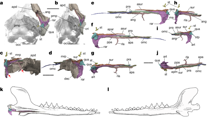 研究进一步表明,从受力的颌关节到听骨关节的变化,除了各个骨块持续变小,另一个重要的特征,是方骨相对于关节骨向内侧的移动(图四)。这个过程,既能解释颌骨关节受力的逐渐消失,也能解释听力效能的加强,传递从外侧耳膜接收的声波到内侧的镫骨。当关节骨-方骨关节在下颌咬合时不再受力,就为齿骨后骨彻底脱离齿骨并向脑颅基部转移提供了一个必要的前提条件。此外,在杨氏滇尖齿兽和周氏近柱齿兽中,骨化麦氏软骨比较纤细,位于齿骨后骨前部,但齿骨后骨仍贴在齿骨上;在辽尖齿兽(Liaoconodon)的过渡型中耳,以及更进步的源掠兽(Origolestes)中,骨化麦氏软骨变得粗壮并后移,为变小后缩并与齿骨分开的听小骨(齿骨后骨)提供了支撑。因此,骨化麦氏软骨在齿骨后骨从齿骨向颅基部迁移的过程中,起到了一个重要的辅助过渡作用。