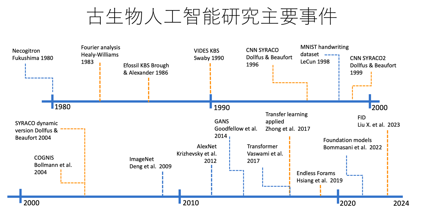 图1. 古生物人工智能研究主要事件(橙色)与部分人工智能重要算法与数据集(蓝色)时间线
