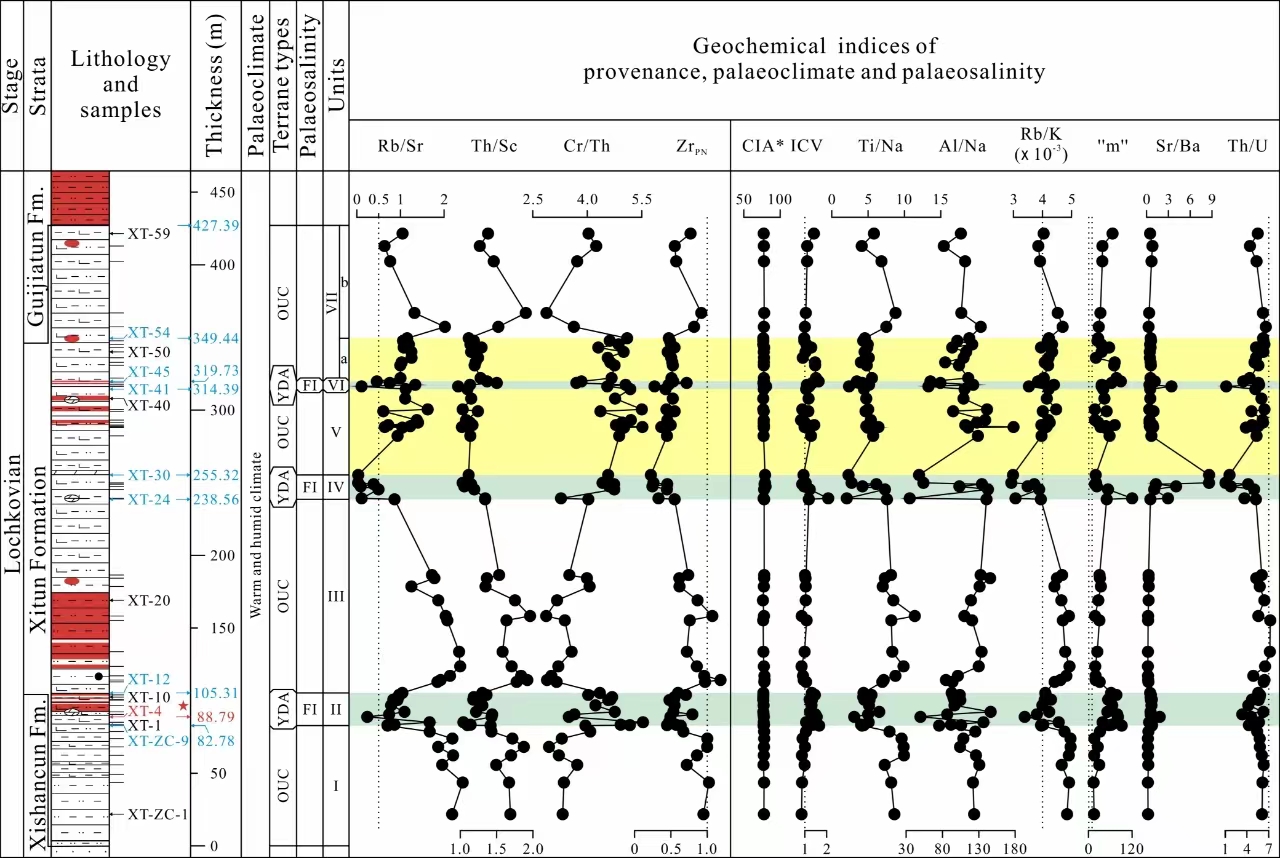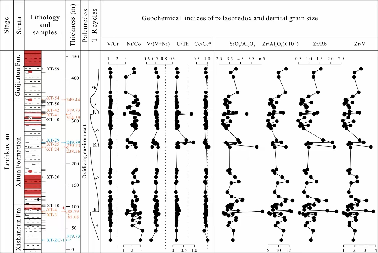西屯组沉积期的沉积构造背景、物源、古气候、古氧相等也是恢复西屯脊椎动物群生境的重要方面。研究团队对滇东曲靖地区西屯组复合剖面上93个地化样品中主量、微量和稀土元素进行了全面的分析,得出如下新认识:西屯组样品的主量元素测试数据在K2O/Na2O–SiO2判别图解上的投点分布特征,指示地处华南板块西南边缘的滇东曲靖地区在早泥盆世期间位于被动大陆边缘上;微量及稀土元素的测试数据在Co/Th–La/Sc及Th–Hf–Co与La–Th–Sc判别图解上的投点特征则指明,西屯组样品的化学成分更接近于平均上陆壳和显生宙克拉通砂岩的化学成分,其物源以稳定型的沉积岩为主;西屯组样品中的Zr值以及Rb/Sr、Th/Sc与Cr/Th比值的变化曲线及稀土元素特征(轻稀土富集、明显的Eu负异常)等均表明,西屯组的主要沉积物有长英质和镁铁质碎屑两种,镁铁质碎屑的增加与三次海水淡化事件密切相关,位于东侧的会泽-牛头山古岛是西屯组最有可能的的沉积物源区;CIA*与ICV值及Ti/Na、Al/Na和Rb/K比值等是对风化强弱和古气候变化非常敏感的地球化学指标,西屯组地化样品中的相关曲线变化特征表明其沉积时期以温暖湿润的热带气候为主,风化作用不强;V/ Cr、Ni/Co、V/(V + Ni)、U/Th和Ce/Ce*比值常被用来分析古氧化还原条件,西屯组地化样品中的相关曲线变化特征明确指明其沉积期为氧化环境。