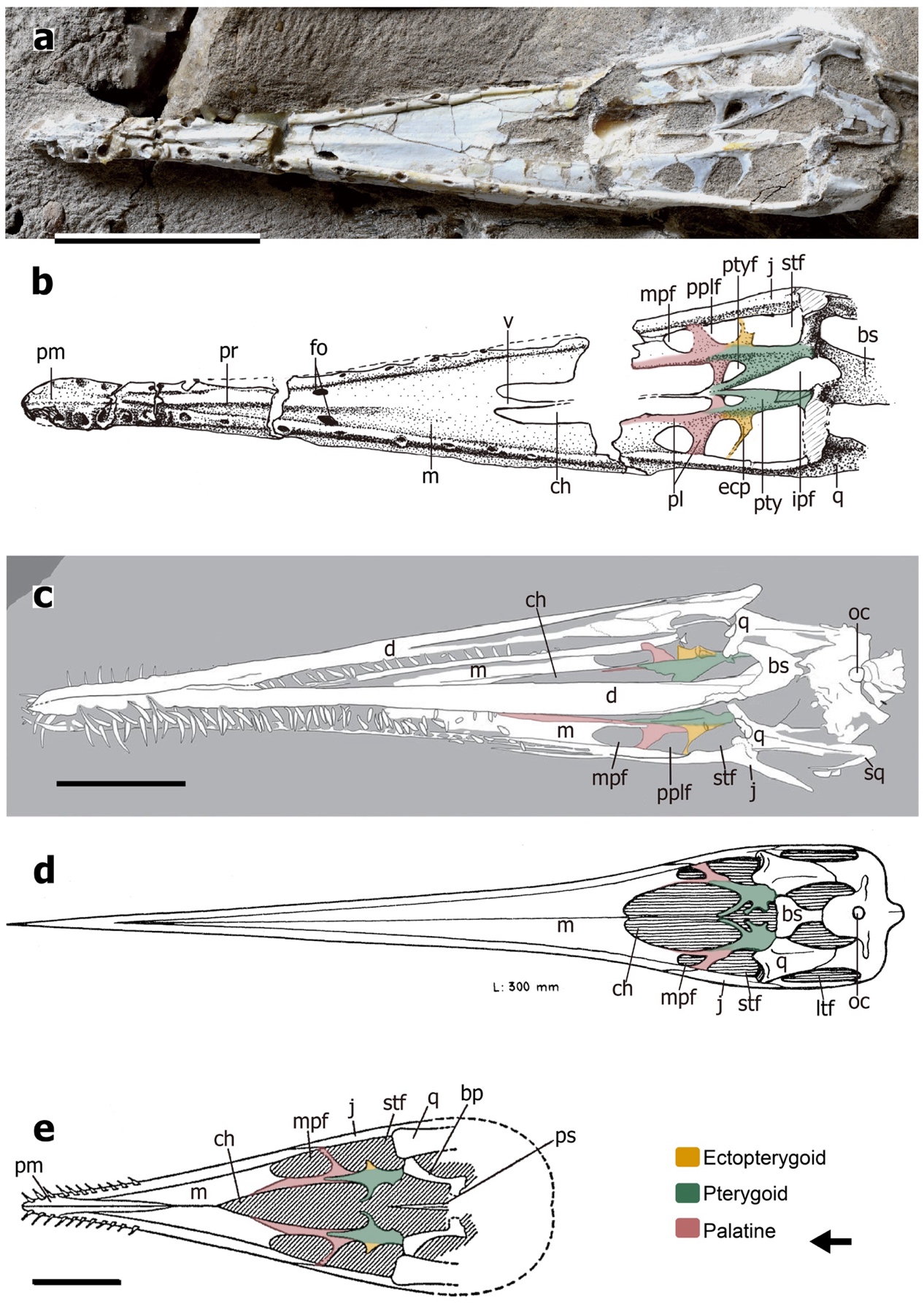 图2 其它翼手龙类的腭区新结构图(黄色:外翼骨;绿色:翼骨;粉色:腭骨)