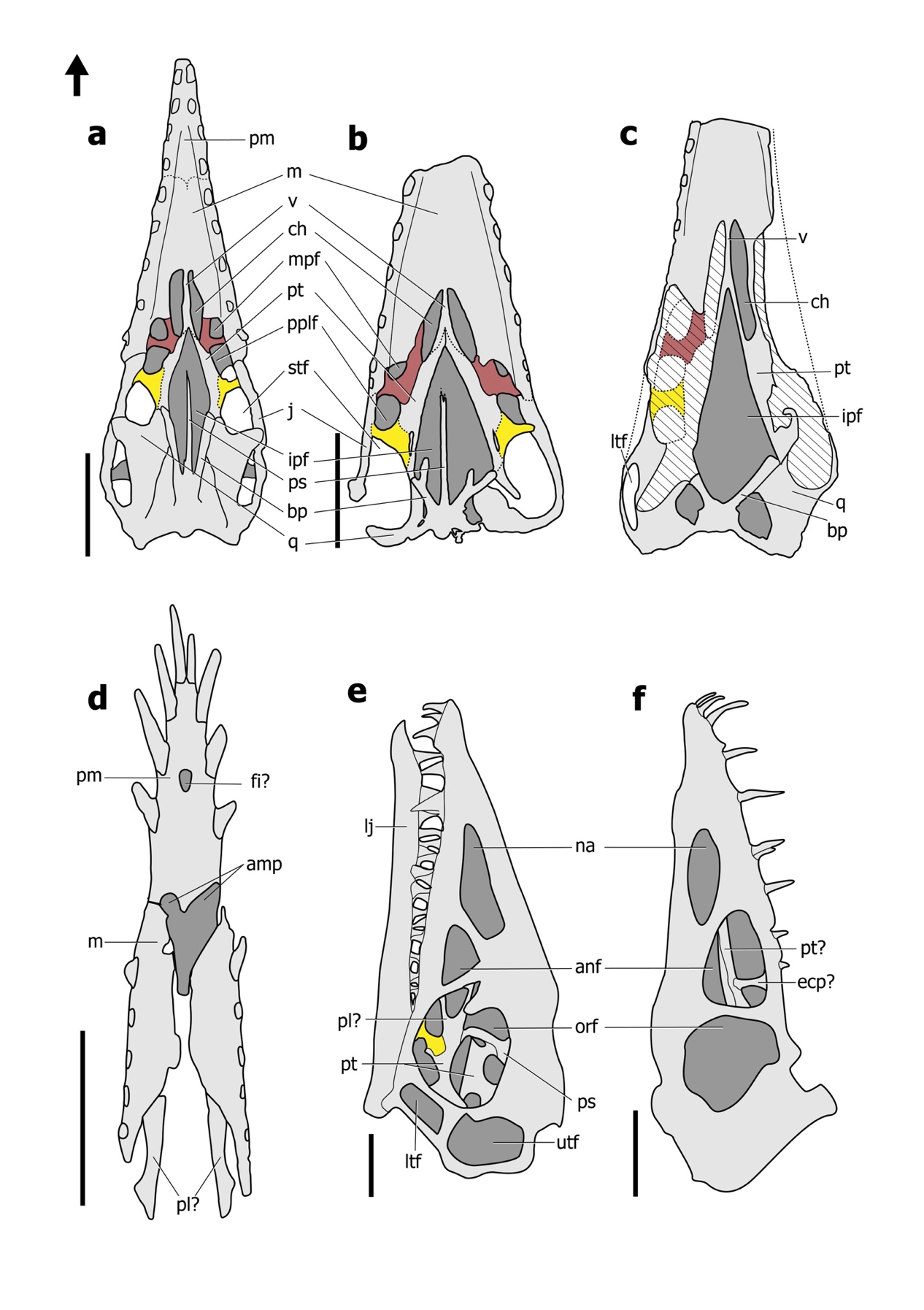 图3 非翼手龙类腭区结构图(黄色:外翼骨;粉色:腭骨)
