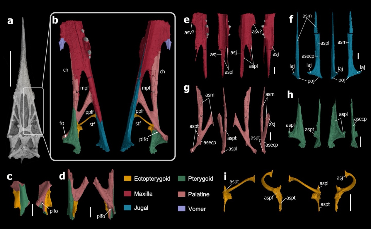 图4. 魏氏准噶尔翼龙腭区CT扫描及三维重建(黄色:外翼骨;红色:上颌骨;蓝色:腭骨;绿色:翼骨;粉色:腭骨;紫色:犁骨)a,b,魏氏准噶尔翼龙(IVPP V 4063);c,准噶尔翼龙(IVPP V 26258);d,准噶尔翼龙(IVPP V 26257);e-i,分别为上颌骨后部、轭骨上颌骨突、腭骨、翼骨和外翼骨(腹视、内侧、背视、外侧视)(古脊椎所供图)