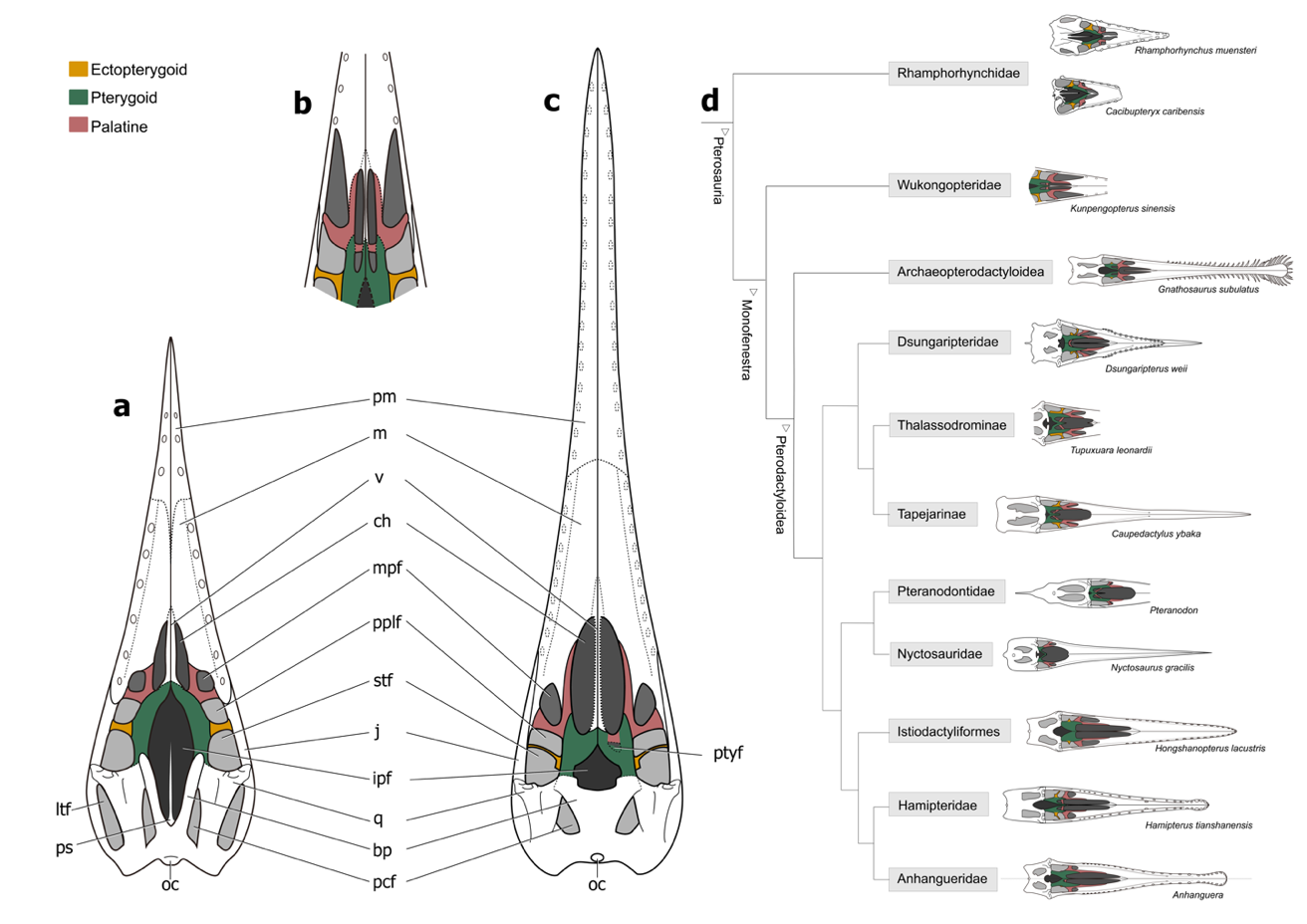 a,基于喙嘴龙和卡其布翼龙建立的非翼手龙类腭区结构模型;b,基于鲲鹏翼龙建立的过渡类型悟空翼龙类腭区结构模型;c,翼手龙类的腭区结构模型;d,翼龙内部各类群腭区重建图(古脊椎所供图)