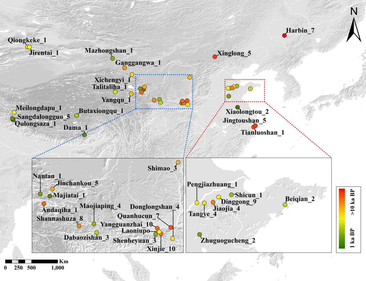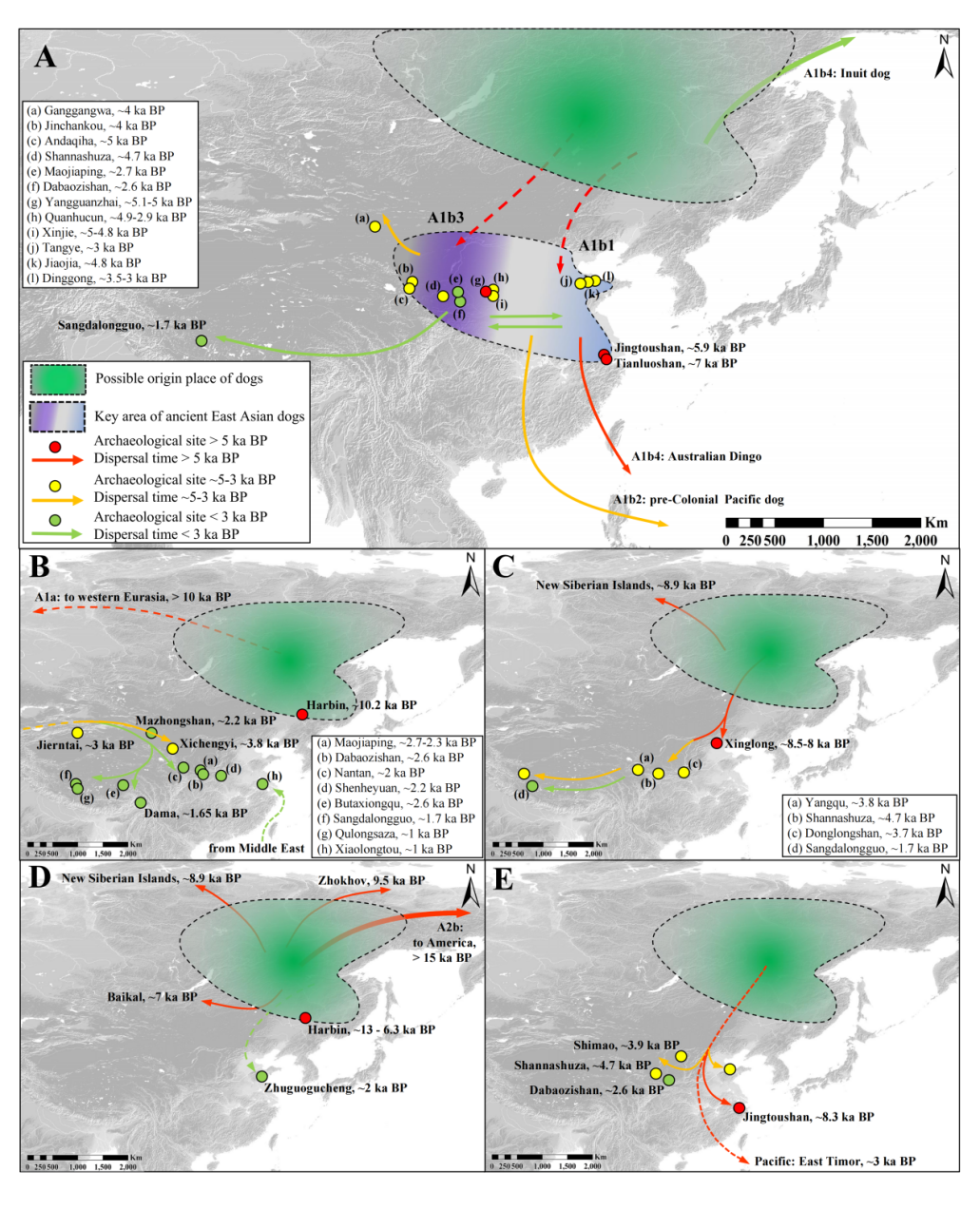该研究成功获取了全国38个遗址的100余例(距今约12,900-1,000年)古代家犬线粒体全基因组数据,是目前东亚地区覆盖遗址最多、获取数据最丰富的家犬古DNA研究。分析表明,东亚家犬可能来源于末次盛冰期时欧亚大陆东北部的家犬群体,随后在东亚地区经历了不同的扩散事件。从4,000年前开始,东亚北方的家犬群体明显受到了欧亚大陆西部家犬群体的遗传影响,特别是过去3,000年以来,这种影响明显增加。此外,青藏高原地区分布的家犬群体至少来源于2次母系扩散事件,分别来自欧亚大陆东部(A1b和A3)和西部(A1a)。本研究对深入理解东亚地区家犬的起源及母系遗传历史具有重要意义。