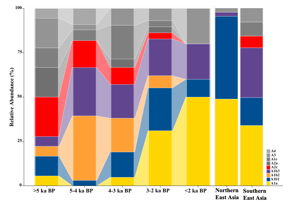 (2)3,000年以来欧亚大陆西部的母系类型在东亚群体中迅速增加。A1a类型构成了现今全球家犬中A类型的62%,几乎所有A1a类型可能都起源于欧亚大陆西部。距今3,000年之前,东亚北方家犬群体以A1b类型为主,距今3,000年以来A1b类型占比大幅下降,而A1a类型比例迅速增加。考虑到A1a类型是欧亚大陆西部家犬的主要类型,以及A1a类型在中国出现的时间和地点所提示的“由西向东”的扩散趋势,表明这种替代可能源于欧亚大陆西部群体的遗传影响。然而,东亚南方和东南亚地区仍然保留了大部分原来的类型(图3)。除此以外,海上的交流可能也对一些地区的家犬产生了遗传影响,来自江苏小龙头遗址(距今约1,000年)的1个个体显示出与中东古代犬类之间的遗传联系(图4B)。