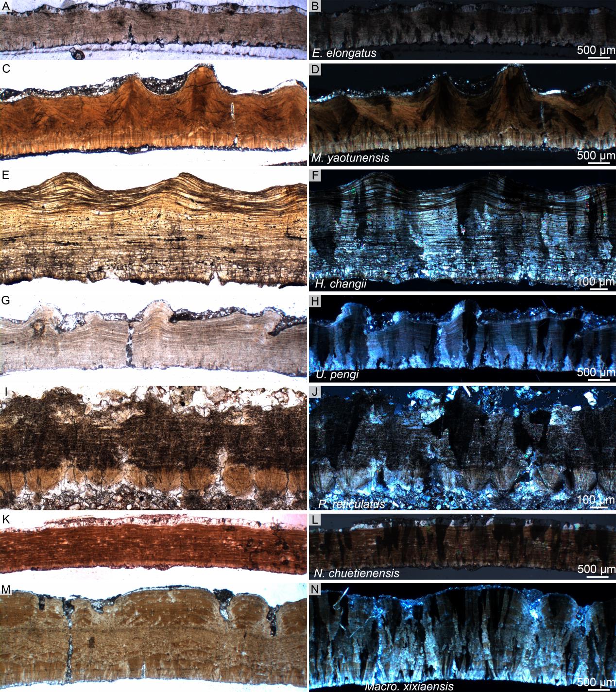 A、B,长形长形蛋(Elongatoolithus elongatus)IVPP V 734;C、D,瑶屯巨形蛋(Macroolithus yaotunensis)IVPP V 2781;E、F,常氏黑山蛋(Heishanoolithus changii)IVPP V 11578;G、H,彭氏波纹蛋(Undulatoolithus pengi)PXM V 0016;I、J,网纹副长形蛋(Paraelongatoolithus reticulatus)IVPP V 16514;K、L,主田南雄蛋(Nanhsiungoolithus chuetienensis)IVPP V 2783;M、N,西峡巨型长形蛋(Macroelongatoolithus xixiaensis)TTM 15。