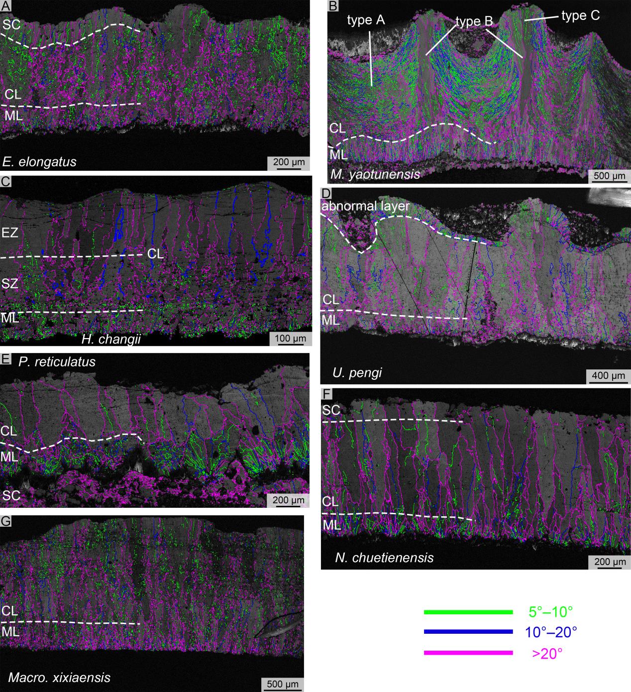 A,长形长形蛋(Elongatoolithus elongatus)IVPP V 734,示由ML和CL组成的蛋壳;B,瑶屯巨形蛋,(Macroolithus yaotunensis)IVPP V 2781,示CL中处于不同部位的三种方解石晶粒形态;C,常氏黑山蛋(Heishanoolithus changii)IVPP V 11578,示CL中EZ的存在;D,彭氏波纹蛋(Undulatoolithus pengi)PXM V 0016,示CL层外出现的异常结构;E,网纹副长形蛋(Paraelongatoolithus reticulatus)IVPP V 16514,ML呈放射的针状,CL呈棱柱状;F,主田南雄蛋(Nanhsiungoolithus chuetienensis)IVPP V 2783,ML的放射状在图中不甚明显,CL呈棱柱状;G,西峡巨型长形蛋(Macroelongatoolithus xixiaensis)TTM 15。ML,乳突层;CL,连续层;SZ,鳞片状超微结构带;EZ,外带;SC,次生方解石。