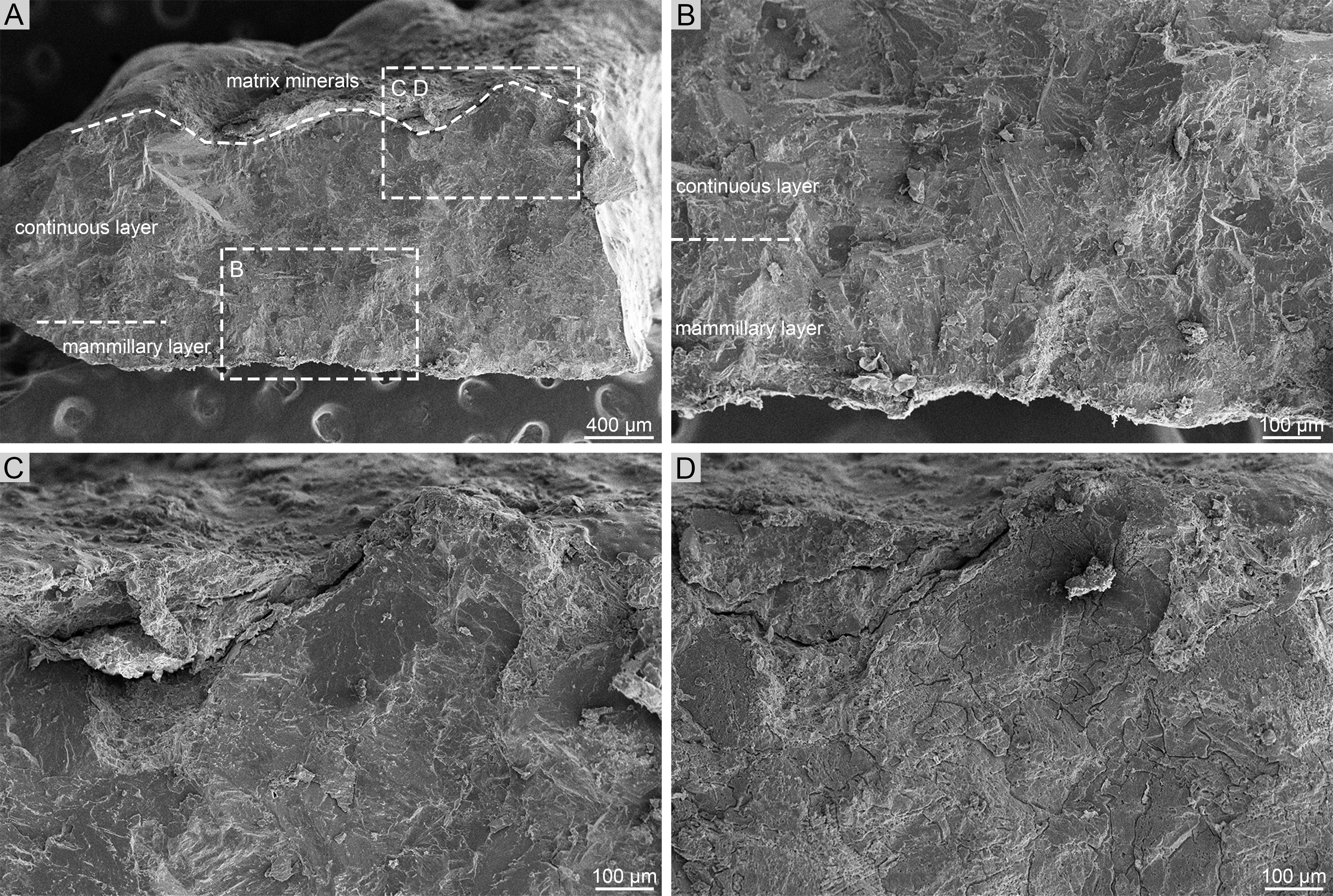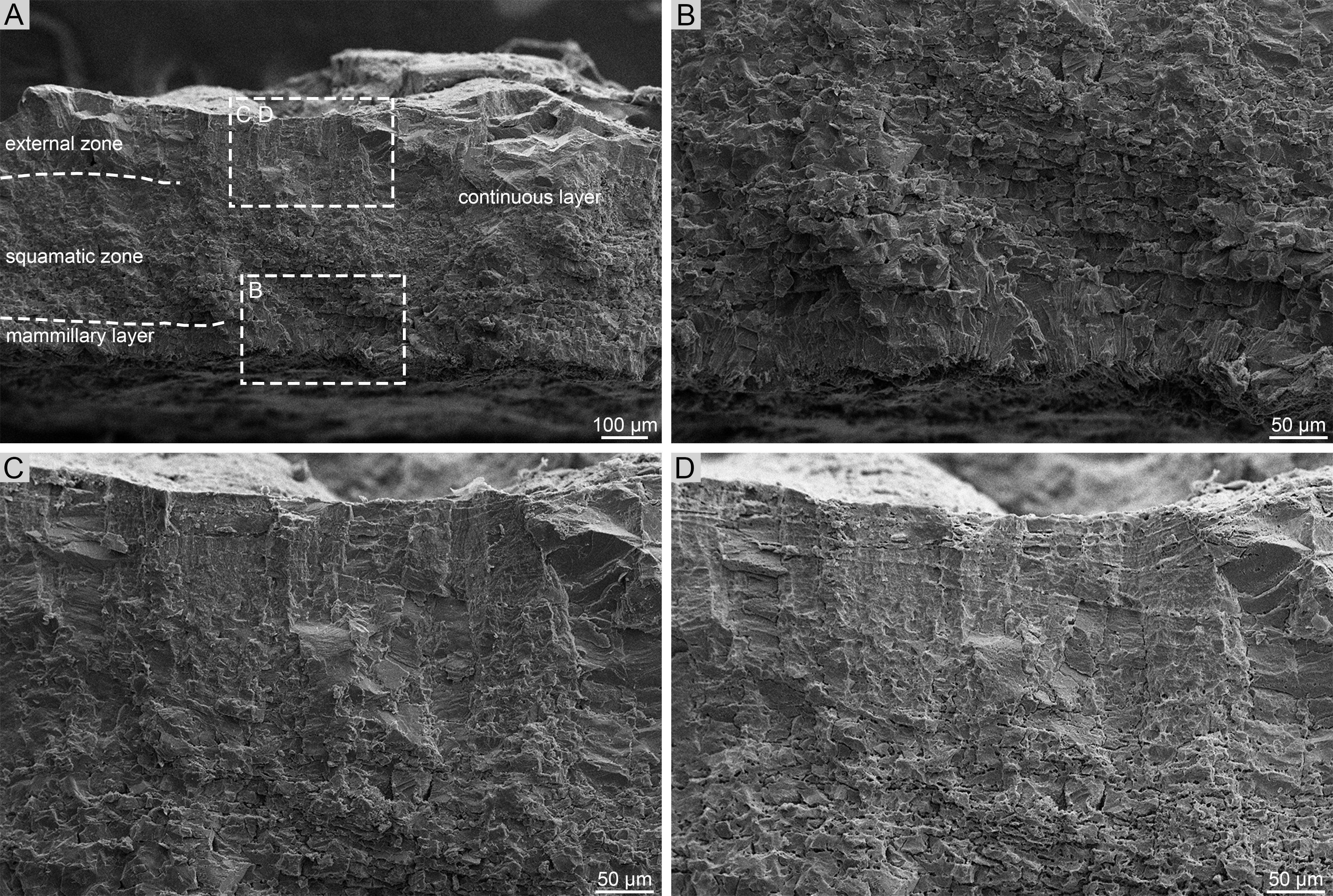 A,蛋壳全貌,示连续层(continuous layer)中鳞片状超微结构带(squamatic zone)与外带(external zone)的分布;B,鳞片状超微结构带;C,蛋壳近外表面,示过渡至外带;D,C视图经酸处理后,外带中起伏的生长纹更为显著。