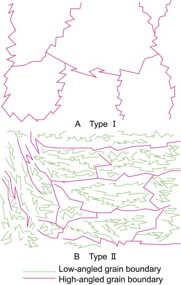 A,Ⅰ型鳞片状超微结构,以崎岖的大角度晶界(>20°)为特征;B,Ⅱ型鳞片状超微结构,以同时具有崎岖的大角度晶界(>20°)与小角度晶界(5~10°)为特征。