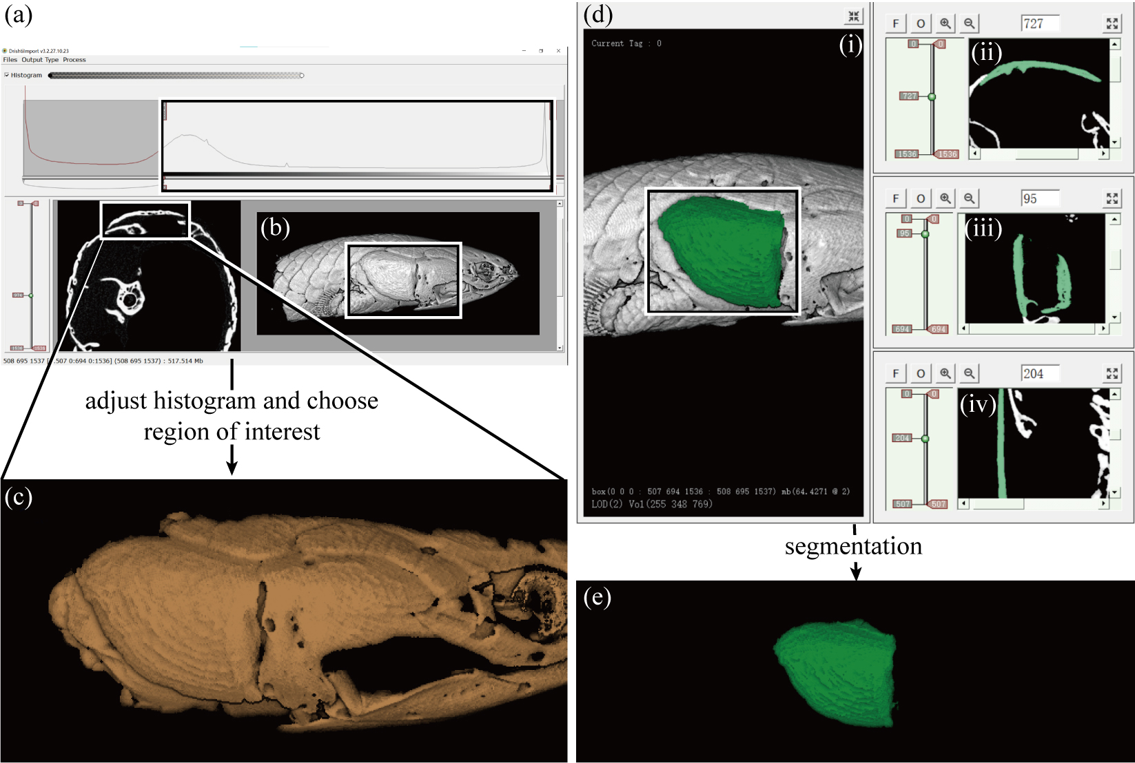图2. 使用Drishti Paint 3.2对多鳍鱼CT扫描数据右侧鳃盖骨进行分割
