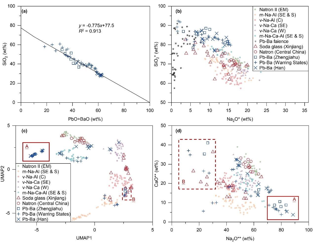 研究团队对湖北云梦郑家湖墓地出土的铅钡玻璃蜻蜓眼珠开展了无损或微损的成分、物相和显微结构分析。基于玻璃成分数据库,实施数据清洗,利用非线性降维算法(均匀流形逼近与投影,UMAP)处理200余组汉代及之前的中外玻璃成分数据,首次识别出铅钡玻璃的钠源为富钠矿物或来自欧亚大陆不同地区的不同类型钠玻璃,硅源还包括额外添加的石英(图2)。