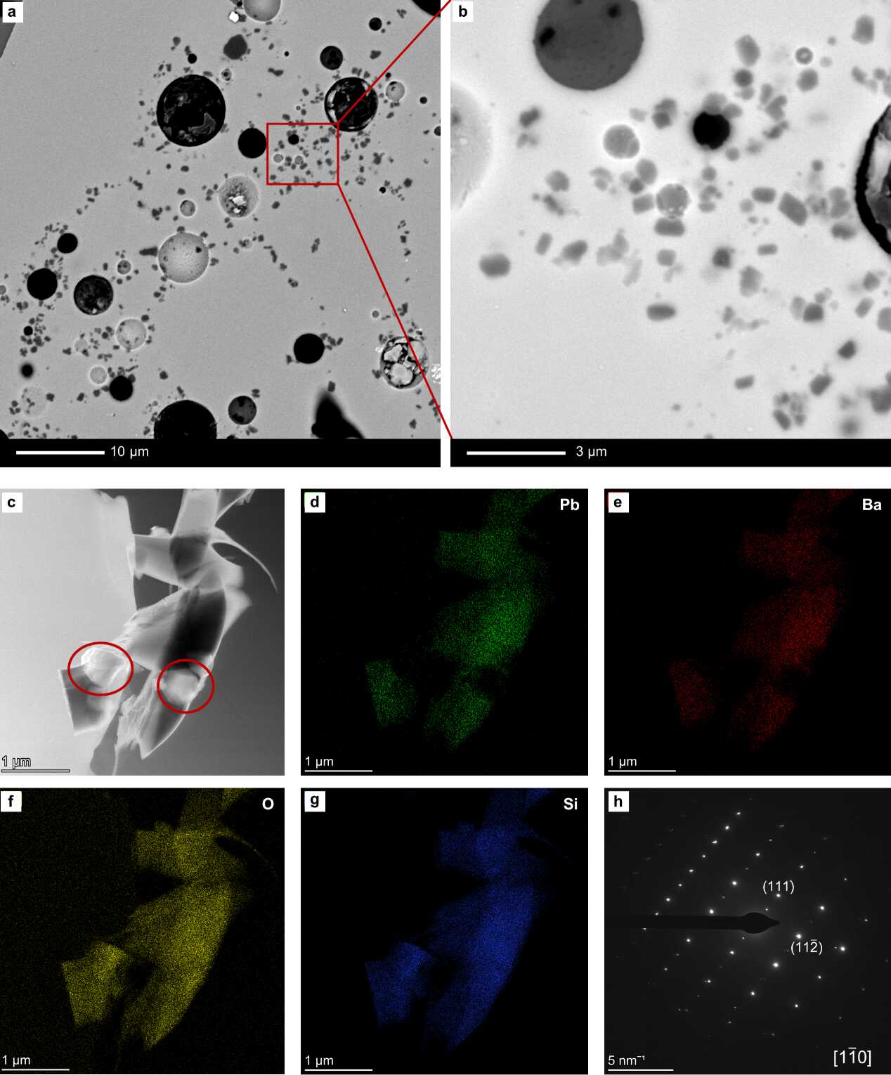 图4 扫描电子显微镜和透射电子显微镜在白色铅钡玻璃中发现大量未熔石英颗粒