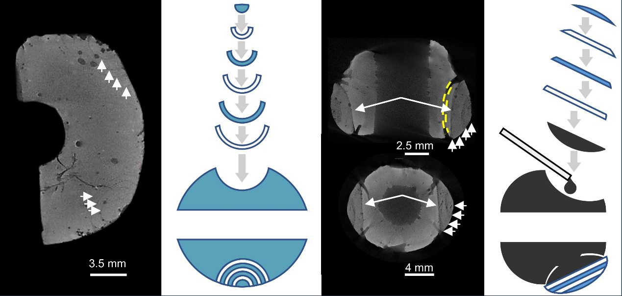 在成型工艺方面,显微CT分析表明,中国古代工匠在仿制外来钠玻璃蜻蜓眼珠的过程中,吸收了外来眼纹装饰中的逐层镶嵌工艺,但目前没有发现引进缠绕工艺制作珠子基体,并首次实证基体的铸造成型与独特的镶嵌技术(图5)。