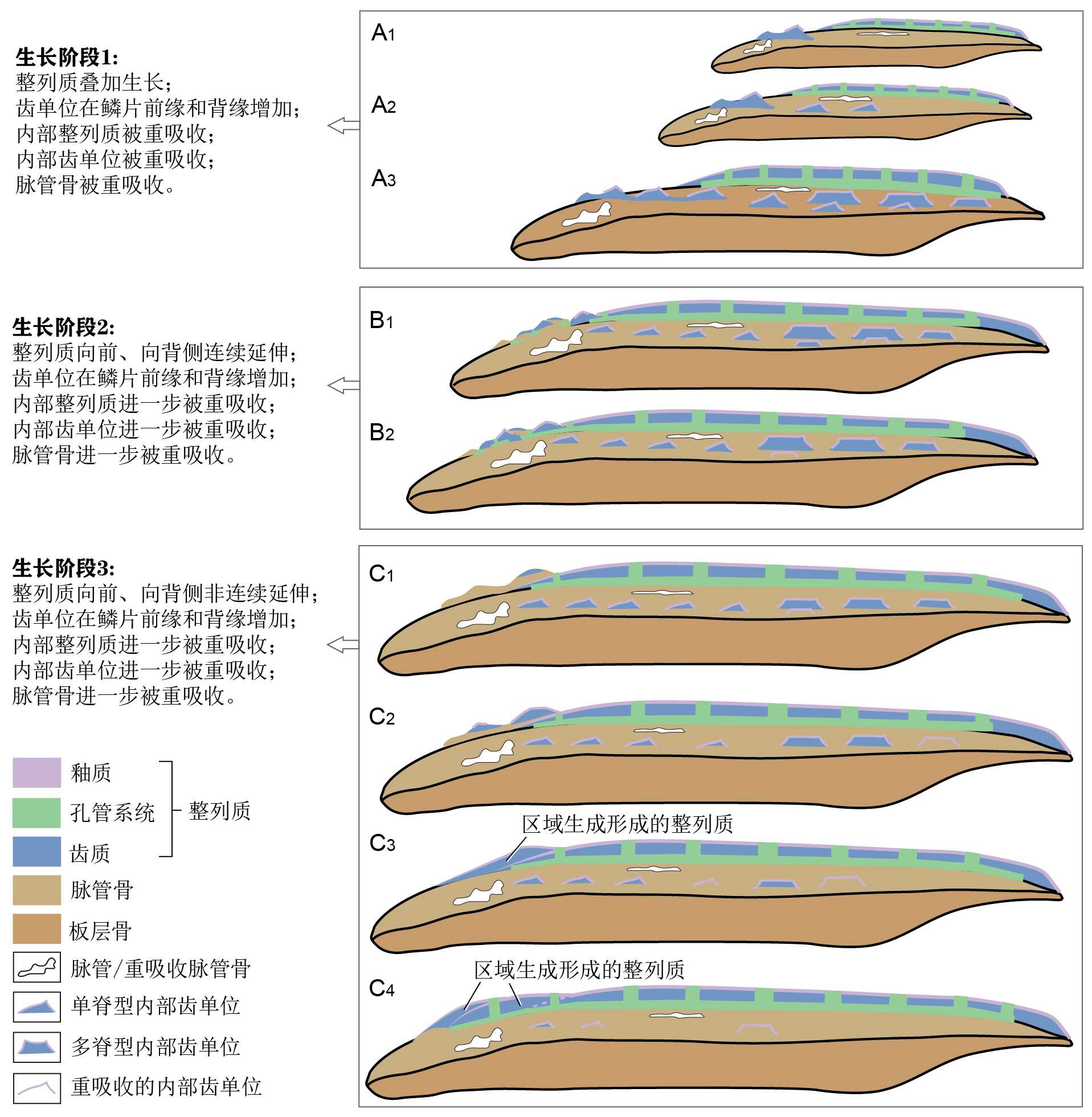 图3. 早期硬骨鱼类鳞片整列质演化。(崔心东供图)