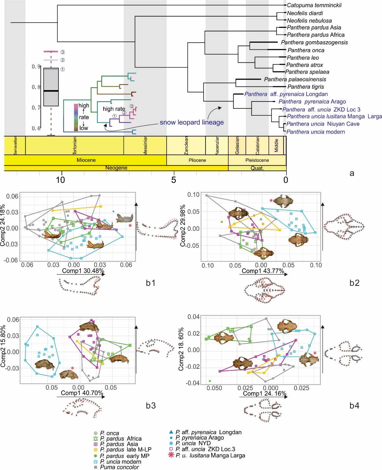 图2. 现代和化石雪豹的系统发育位置和形态空间。a. 豹属全证据系统发育树,以及形态演化速率;b. 对化石雪豹与现代相关物种头骨和下颌骨侧视图的几何形态分析,b1. 下颌侧视图;b2. 头骨背视图;b3. 头骨侧视图;b4. 头骨腹视图。