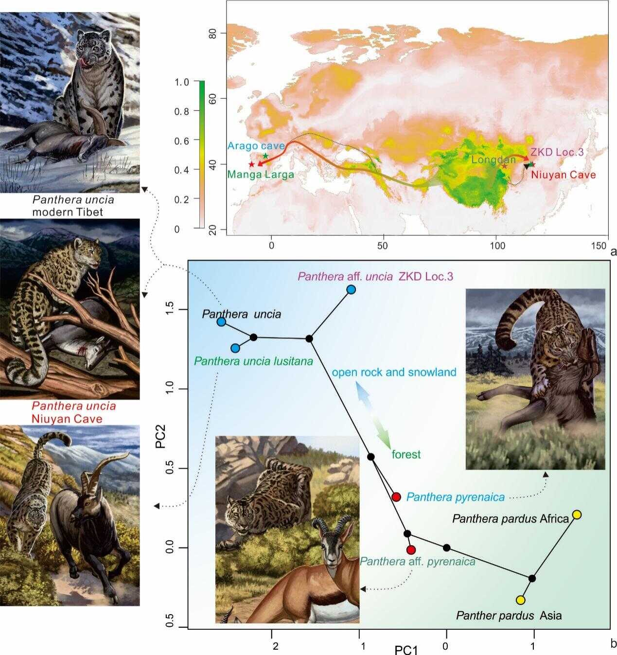 图3. SDM预测现代和化石雪豹的适宜分布和形态空间。a. 在末次冰盛期气候条件下雪豹的适宜地理分布预测;b. 功能性状的主成分分析(PCA)形态空间,包含化石和现代雪豹的重建。艺术作品由叶健豪创作。