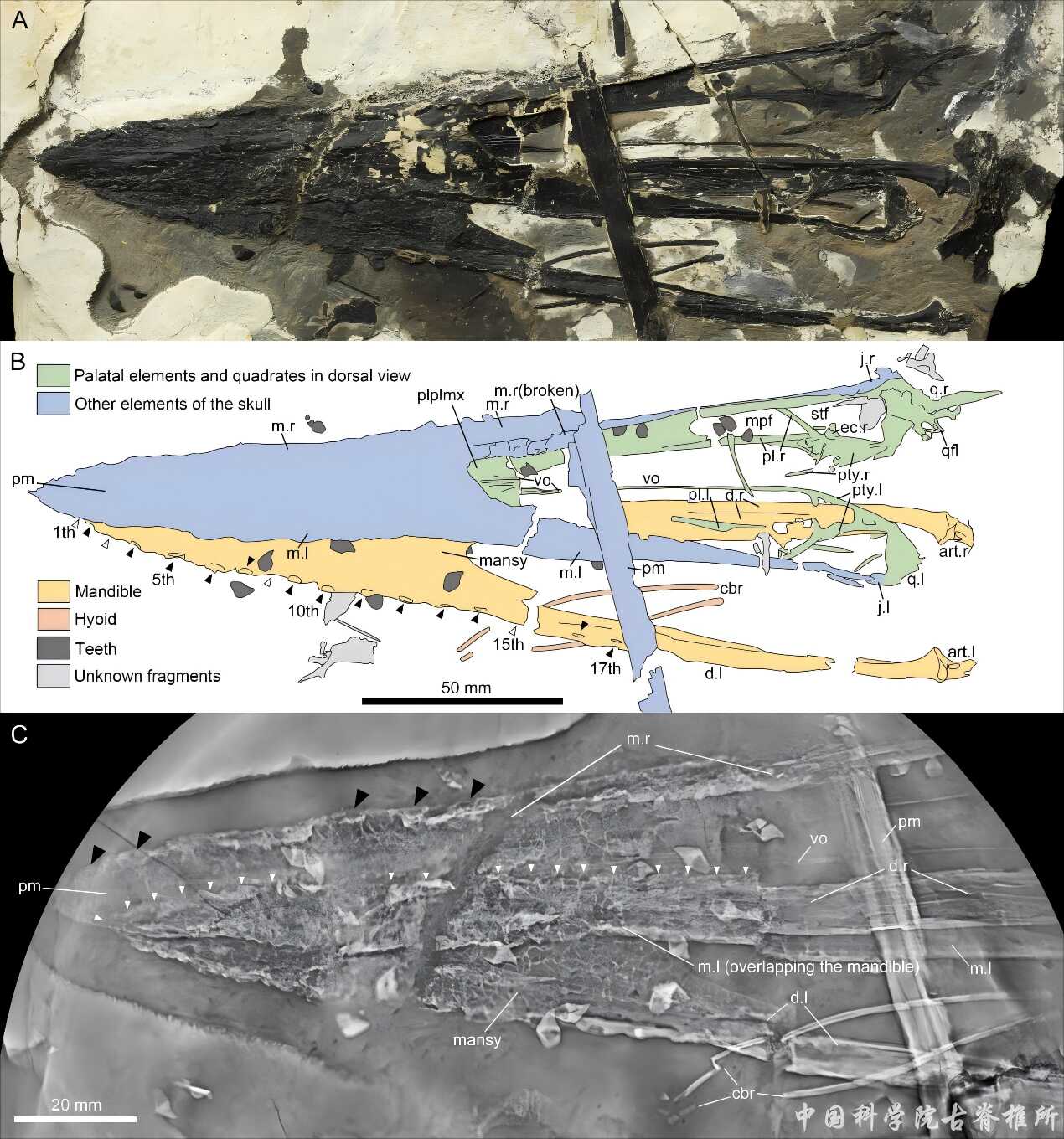 图2 湖泊红山翼龙新标本(IVPP V 33029)头骨主体部分照片(A)、线图(B)及头骨前部平板CL扫描图像(C)