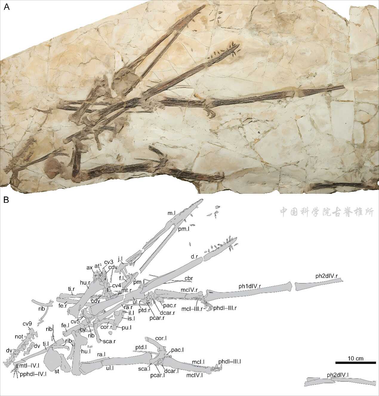 图3 布氏努尔哈赤翼龙正型标本(A)及线图(B)(IVPP V 13288)