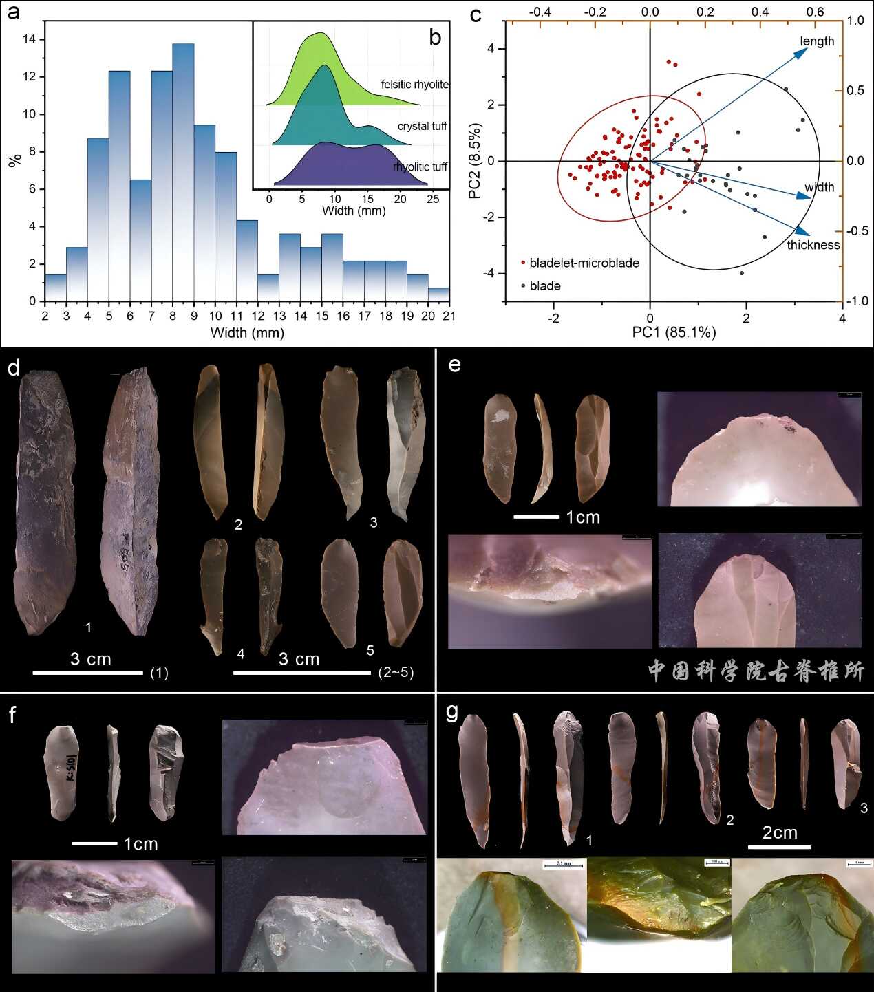 图2 西山头遗址出土的石叶类技术遗存(a~f)及软石锤直接锤击实验样品(g)