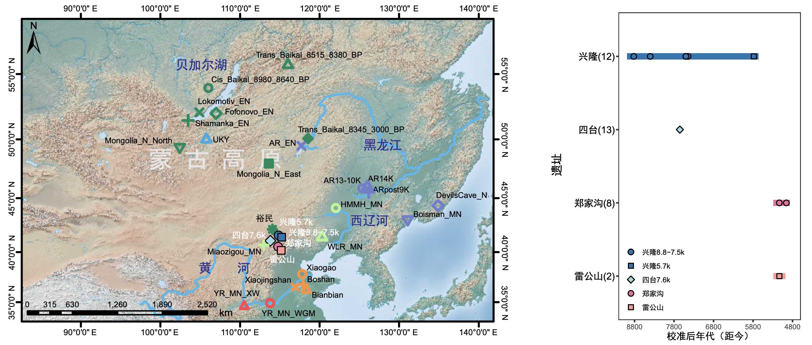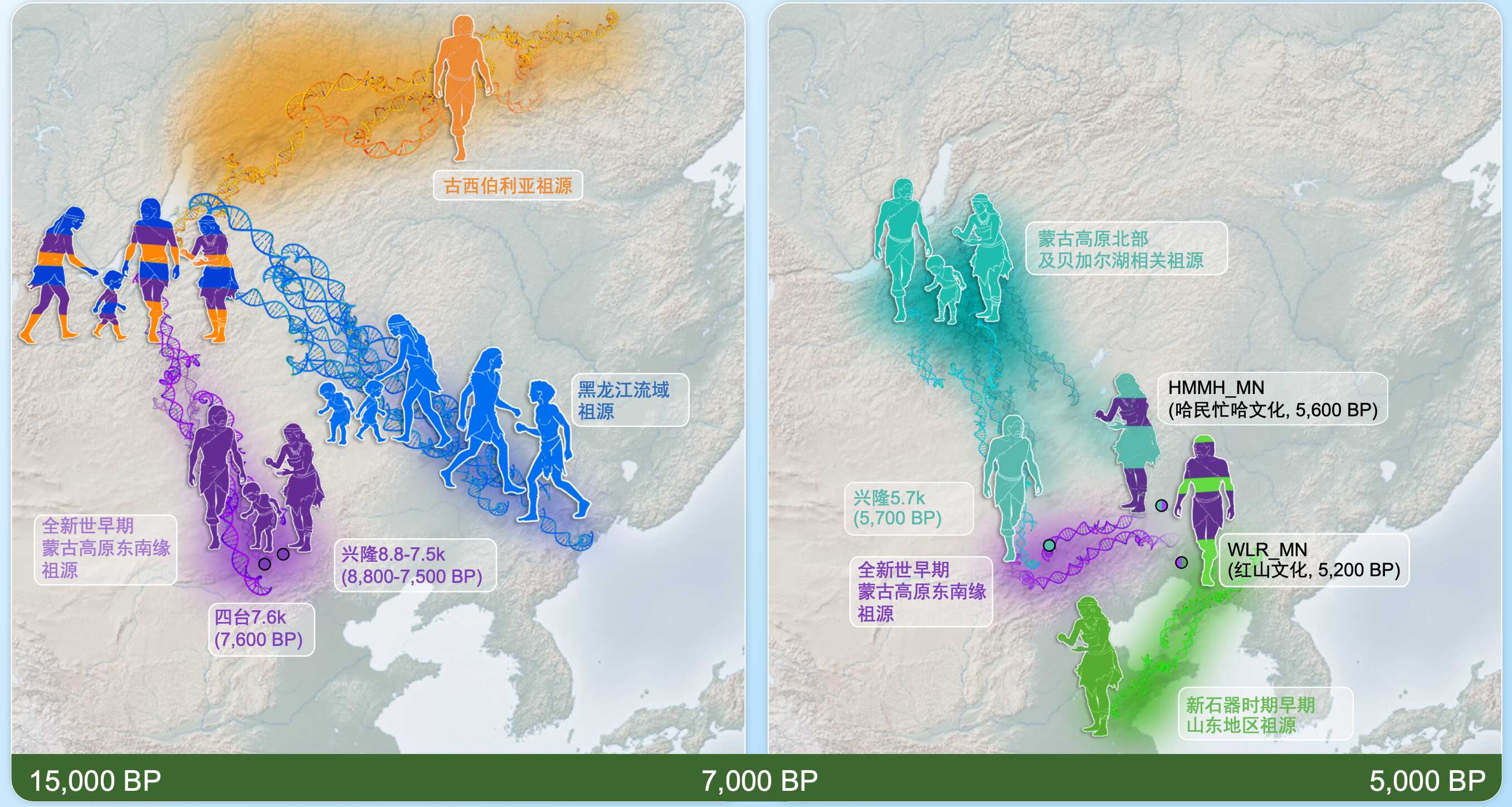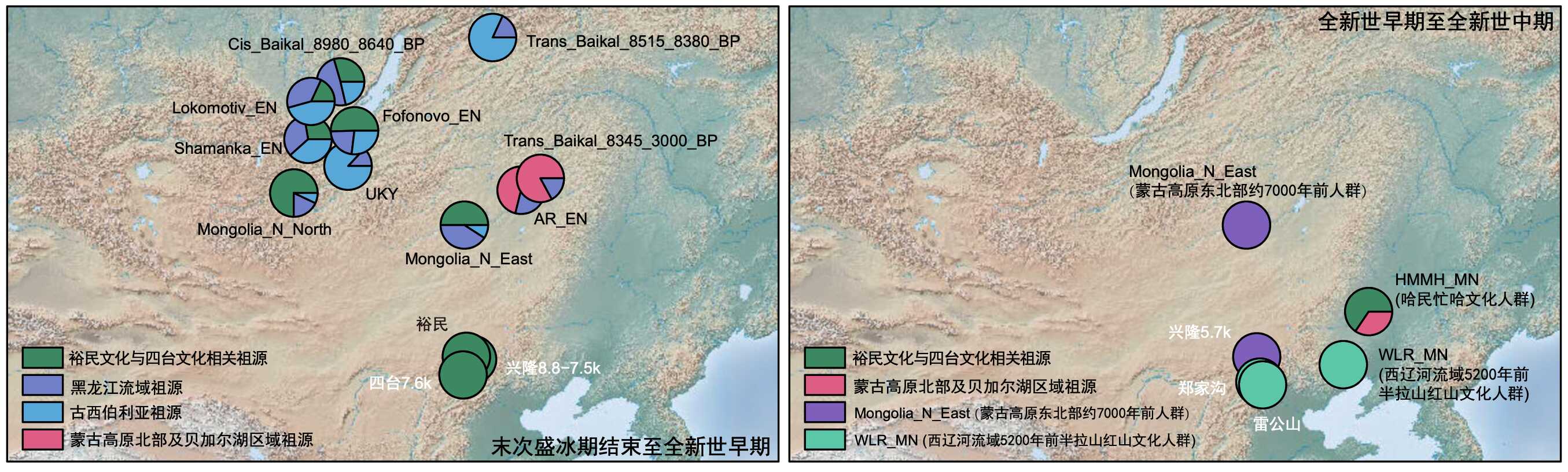 裕民文化和四台文化人群所代表的蒙古高原东南缘祖源还成为东北亚地区后期诸多文化人群的直接来源,自旧石器时代末期至新石器时代中期,蒙古高原东南缘与蒙古高原北部、环贝加尔湖区域及西辽河流域等地之间持续存在遗传交流。蒙古高原东南缘祖源在距今1.4-1.1万年前对贝加尔湖及蒙古高原北部人群均有遗传贡献,与细石叶技术扩散年代一致,表明跨蒙古高原的人群流动推动了这一技术的传播。这一祖源还对西辽河流域新石器时期中期的哈民忙哈文化和红山文化产生了重要遗传贡献,显示蒙古高原东南缘是多支后期文化人群的直接来源地。此外,距今约5700年前,蒙古高原东南缘人群遗传连续性被来自蒙古高原东北部距今约7000年前人群所打破,并与兴隆遗址同时期的文化变革相吻合,表明考古文化巨变伴随显著人群更替。蒙古高原东南缘距今约5000年前的郑家沟、雷公山人群在文化与遗传上均与红山文化高度一致,说明红山文化晚期向西南扩散亦伴随着显著迁徙。这些发现实证了蒙古高原东南缘作为连接周边人群往来、文化互动的枢纽地位。