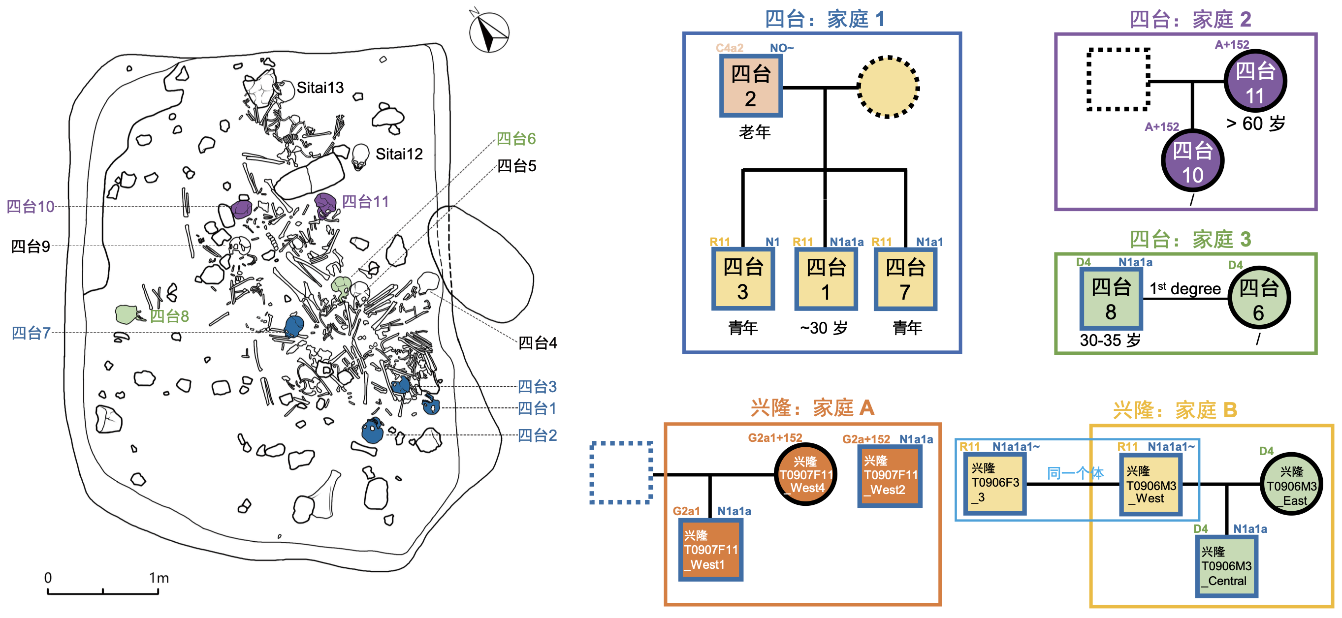 除此之外,兴隆遗址的合葬墓中出现了非亲缘关系成员,四台遗址合葬墓的13个个体更是包含了3个不同的家庭以及3个不属于其中任何一个家庭的个体,这表明在以家庭为核心之外,兴隆和四台社群可能同样开放接纳非血缘的家庭成员,形成家庭—跨家庭的社会组织,以及包含非血缘家庭成员的合作包容的社会结构。考古学家认为在距今6000至4800年前仰韶文化中晚期出现的跨家庭合葬墓标志着社会结构复杂化以及更大型社会组织的萌芽,而距今7600年前四台遗址遗传学实证的跨家庭合葬将其更往前推进了至少1600年。