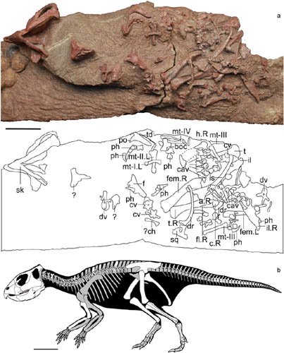 镶嵌角龙标本照片、线条图及复原骨架图,比例尺=10cm。(郑文杰供图)