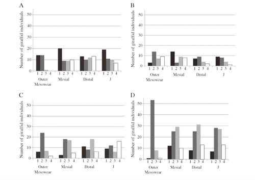 图1 化石长颈鹿牙齿中磨痕变量类型统计图; A,Samos地点;B,Pikermi地点;C,临夏盆地;D,中国北方(侯素宽供图)