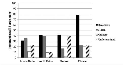 研究结果显示,希腊(Pikermi地点和Samos地点)的长颈鹿类化石含大量的食草类型,而中国(中国北方和临夏盆地)的长颈鹿类化石则包含更多的混合食性类型。这表明在晚中新世,受地中海气候影响的希腊可能较受东亚季风影响的中国的气候更加湿润。