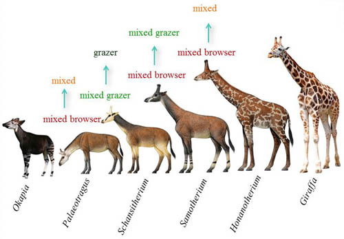 图3 化石和现生长颈鹿类的食性(复原图由陈瑜绘制)