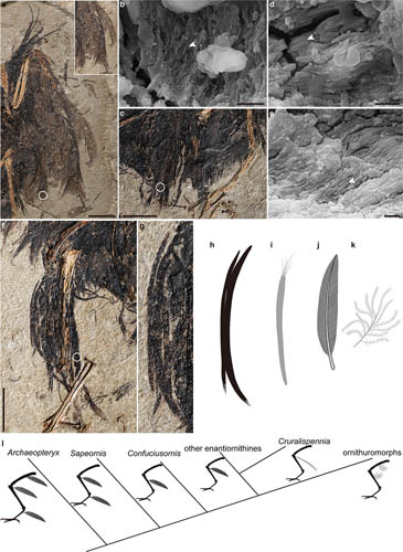 图2 多齿胫羽鸟羽毛和色素体,胫跗骨羽毛复原以及早期鸟类后肢羽毛演化(王敏供图)