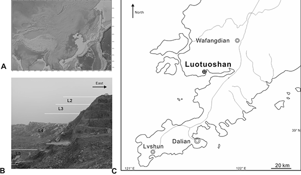 图1.大连骆驼山金远洞的位置和剖面(江左其杲 供图)