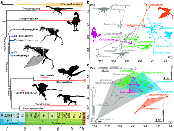 图3. 中生代虚骨龙类系统树和肢骨演化:在飞行起源时,副鸟类不同类群显示出不同的前肢加长过程:善攀鸟龙类通过肱骨加长,结合第三手指和棒状长骨附着膜质翅膀;而驰龙类、伤齿龙类和鸟类则通过掌骨的加长以附着羽状翅膀(王敏供图)